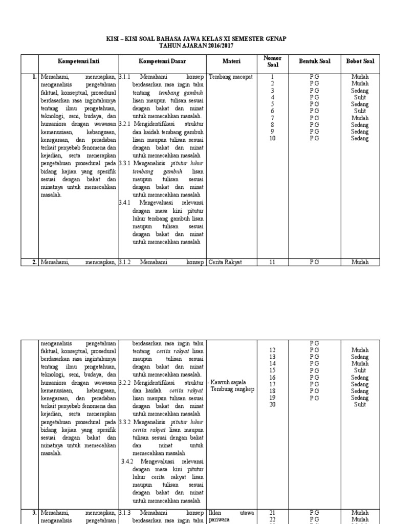 Kisi-kisi soal ini disusun dengan mempertimbangkan tujuan pembelajaran kurikulum yang berlaku, mencakup aspek pemahaman, penerapan, dan apresiasi terhadap Bahasa Sunda dan budayanya. Dengan memahami cakupan materi dan jenis soal yang akan dihadapi, siswa dapat belajar lebih terarah dan percaya diri.